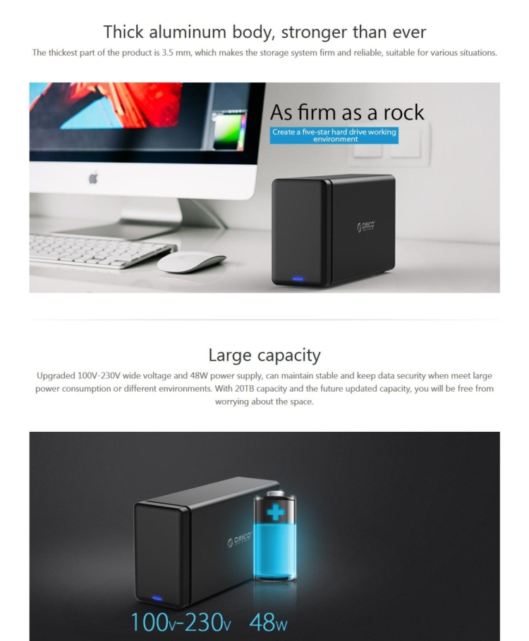 4. Large capacity: Upgraded 100V-230V wide voltage and 48W power supply, can maintain stable and keep data security when meet large power consumption or different environments. With 20TB capacity and the future updated capacity, you will be free from worrying about the space.