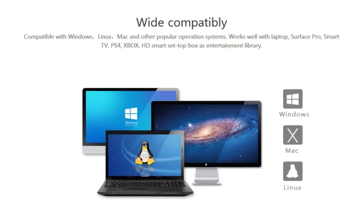 5. Wide compatibly: Compatible with Windows, Linux, Mac and other popular operation systems. Works well with laptop, Surface Pro, Smart TV, PS4, XBOX, HD smart set-top box as entertainment library.