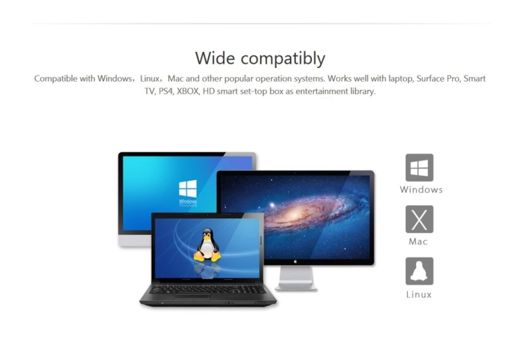 5. Wide compatibly: Compatible with Windows, Linux, Mac and other popular operation systems. Works well with laptop, Surface Pro, Smart TV, PS4, XBOX, HD smart set-top box as entertainment library.
