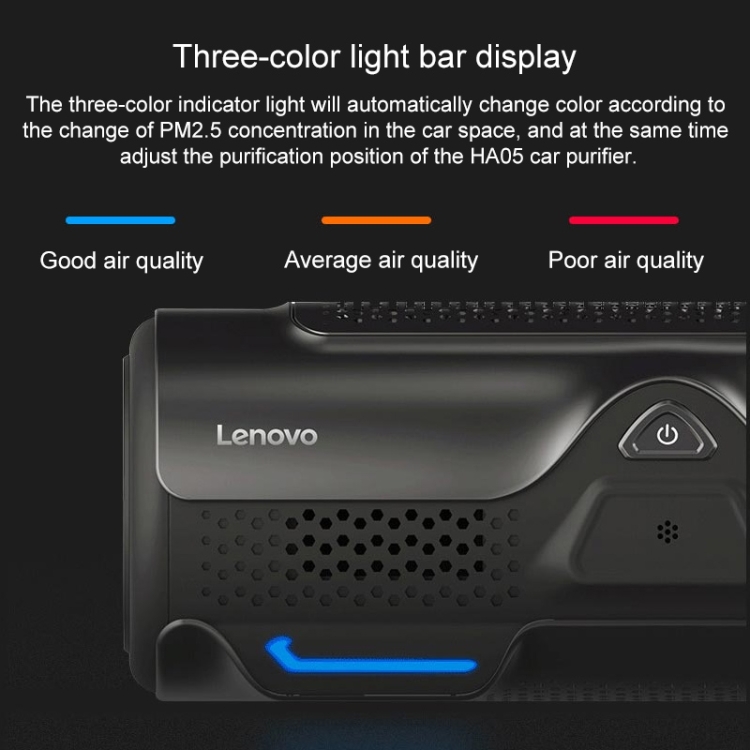 7. There are air quality indicator light strips on both sides of the fuselage, and three-color indicator lights are designed. According to the change of PM2.5 concentration in the car space, the three-color light strip will automatically change color and adjust the purification level of the car purifier. Position, feedback air quality in the car