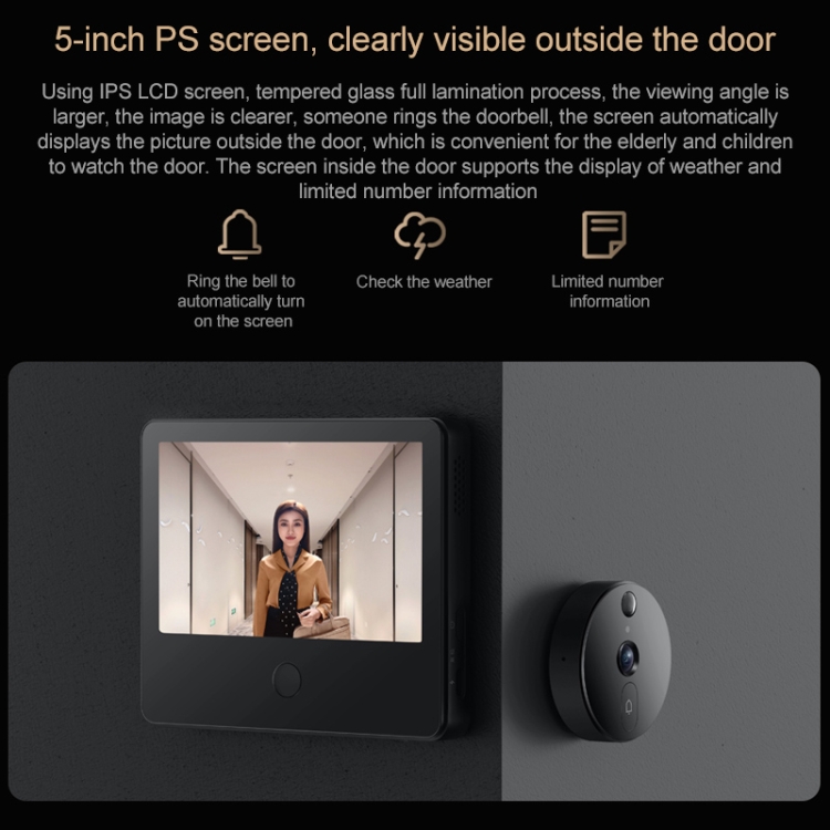 1. With 5-inch IPS screen. 160-degree wide-angle, F2.0 large aperture, 1080P high-definition camera, wide monitoring range and clear picture quality