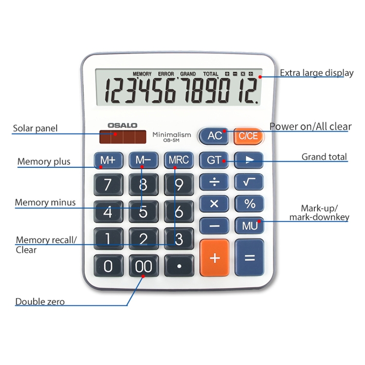OSALO OS-5M 12 Digits Desktop Calculator Solar Energy Dual Power Calculator