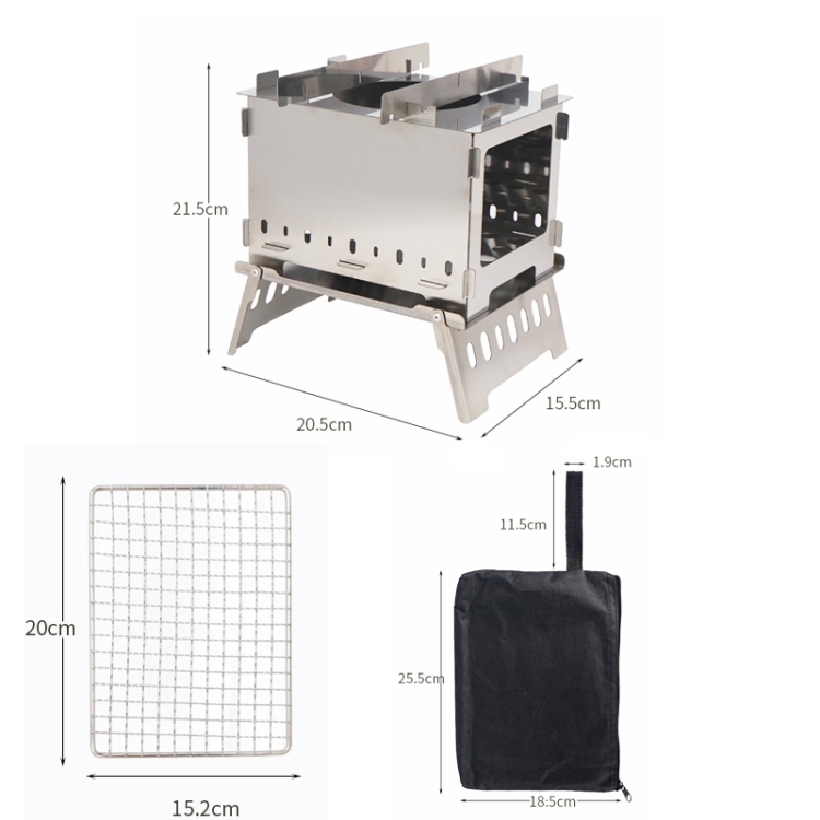 1. Material: furnace body -430 stainless steel, grilled mesh -304 stainless steel, storage bag-Oxford cloth