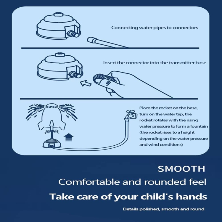 3. Put the rocket on the base, turn on the tap, and the rocket will rotate with the water pressure to form a fountain (the height of the rocket rises depends on the water pressure and wind conditions)