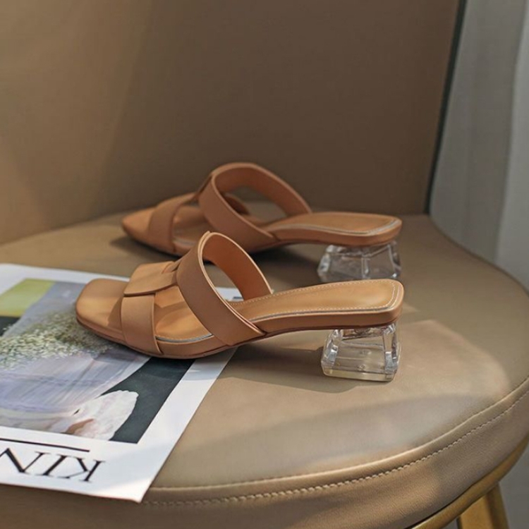 Outerwear Retro Soft Leather Chunky Heel Square Toe Open-toed Sandals