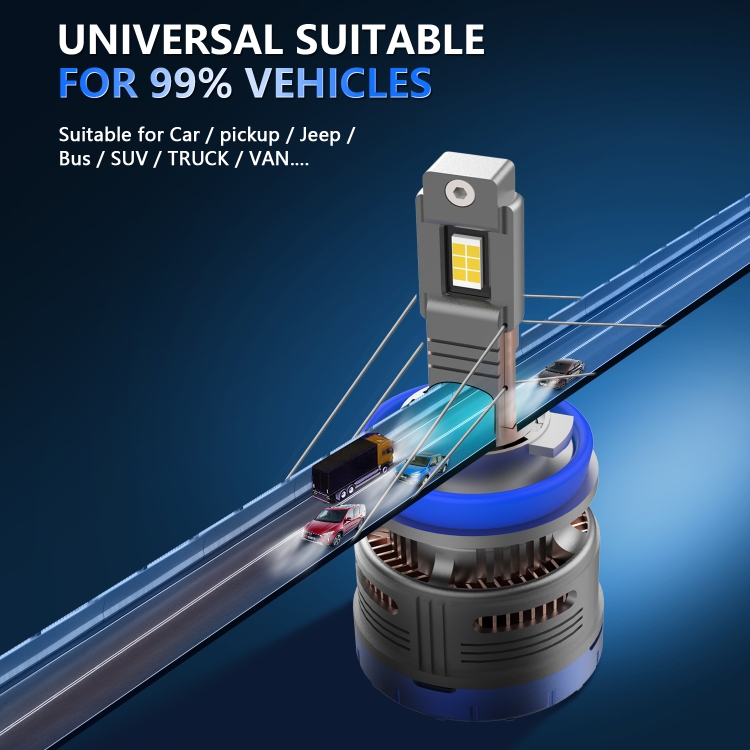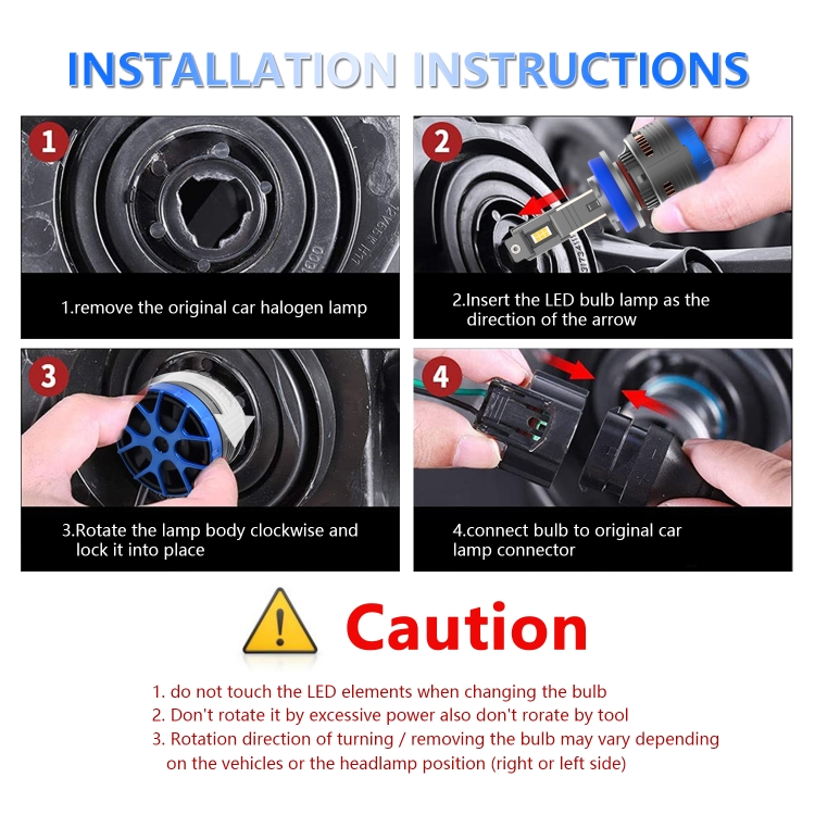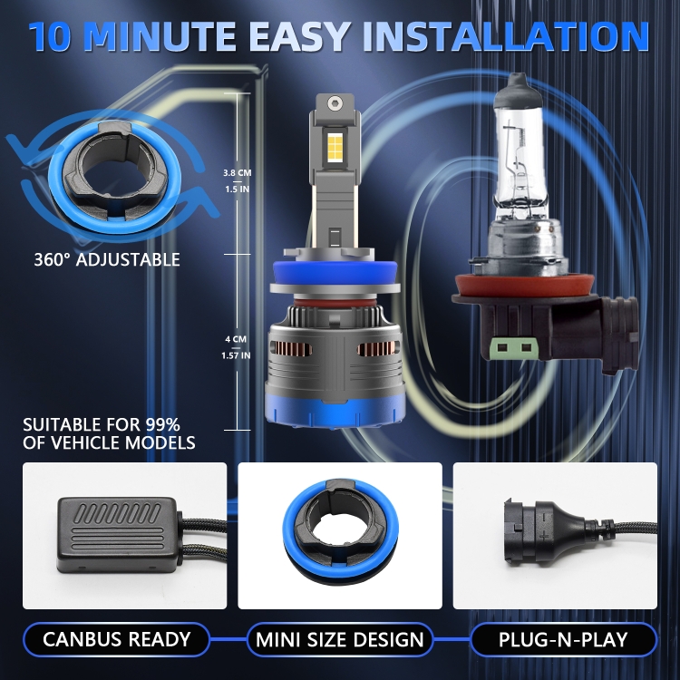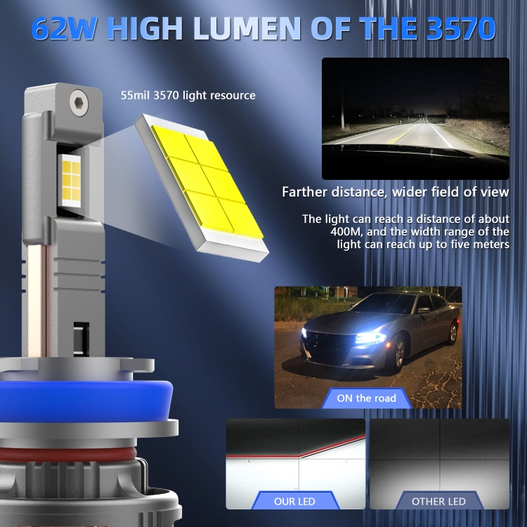 4. The bulb uses six high-efficiency CSP-3570 LED chips, with a service life of up to 50,000 hours and an illumination of 600W 6500K per pair. The luminous flux reaches 80000 lumens per pair, brighter than holographic bulbs. Each LED provides extremely bright white light, which helps to clearly see signs and obstacles in advance, (an additional layer of oil film is attached to the surface of the lamp beads, which makes the color temperature of the headlights more stable and effectively reduces light decay).