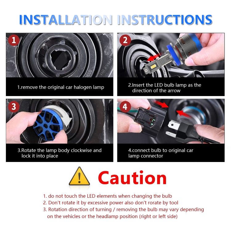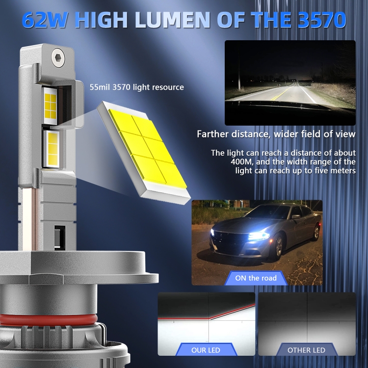 4. The bulb uses six high-efficiency CSP-3570 LED chips, with a service life of up to 50,000 hours and an illumination of 600W 6500K per pair. The luminous flux reaches 80000 lumens per pair, brighter than holographic bulbs. Each LED provides extremely bright white light, which helps to clearly see signs and obstacles in advance, (an additional layer of oil film is attached to the surface of the lamp beads, which makes the color temperature of the headlights more stable and effectively reduces light decay).