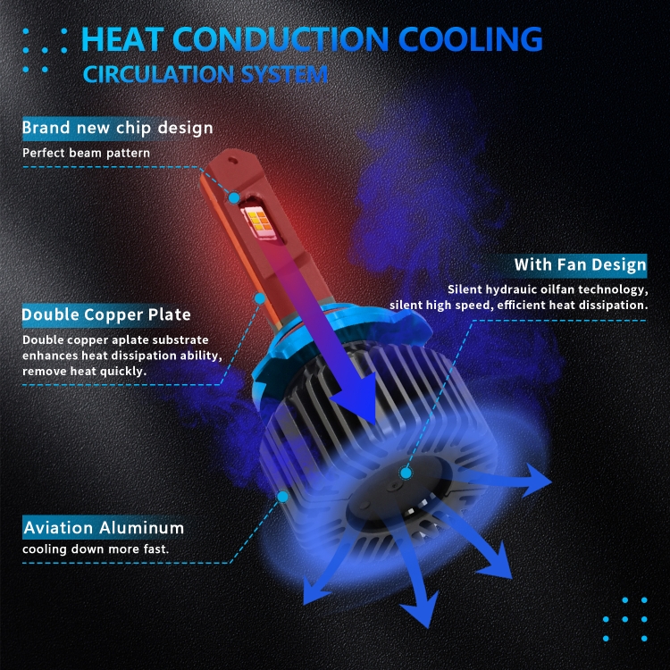 4. Copper substrate + hydraulic fan heat conduction: the lamp bead substrate is composed of high-quality copper sheets, the copper sheet has better heat conduction effect, the substrate and the aluminum lamp body are closely combined and fully contacted, so that the temperature of the lamp beads can be quickly and efficiently transferred to the bottom The cooling effect of the fan is greatly improved.