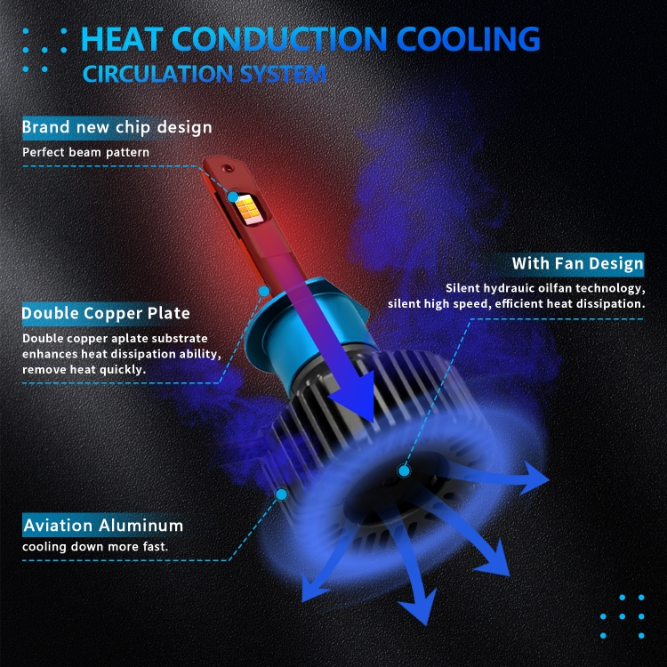 4. Copper substrate + hydraulic fan heat conduction: the lamp bead substrate is composed of high-quality copper sheets, the copper sheet has better heat conduction effect, the substrate and the aluminum lamp body are closely combined and fully contacted, so that the temperature of the lamp beads can be quickly and efficiently transferred to the bottom The cooling effect of the fan is greatly improved.
