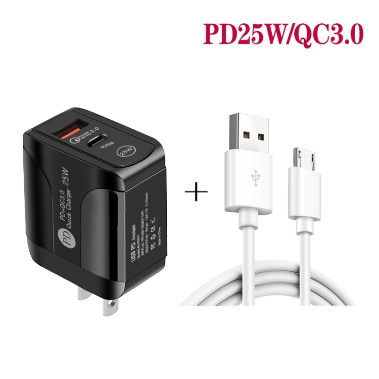 PD25W USB-C / Type-C + QC3.0 Dual Ports Fast Charger with USB to Micro USB Data Cable, US Plug
