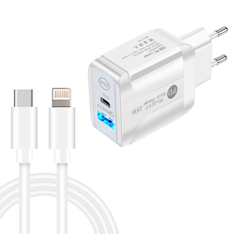 PD25W USB-C / Type-C + QC3.0 USB Dual Ports Fast Charger with USB-C to 8 Pin Data Cable, EU Plug
