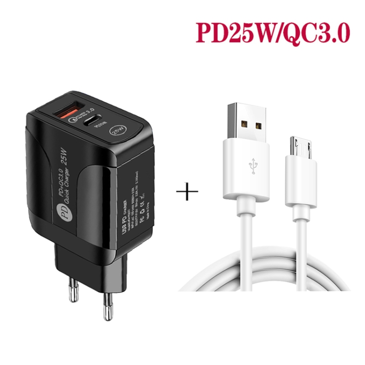 PD25W USB-C / Type-C + QC3.0 USB Dual Ports Fast Charger with USB to Micro USB Data Cable, EU Plug