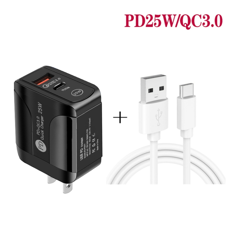 PD25W USB-C / Type-C + QC3.0 USB Dual Ports Fast Charger with USB to Type-C Data Cable, US Plug