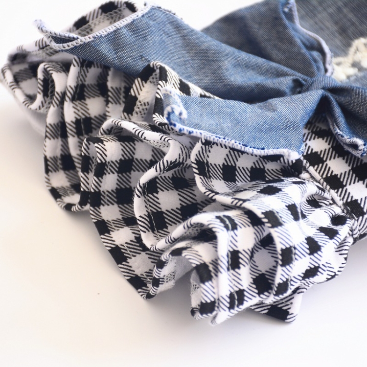 1. Material: the upper body is made of pure cotton denim fabric, and the lower body is made of pure cotton finger knitted fabric