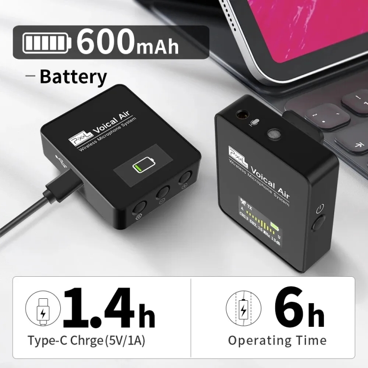 5. Both the transmitter and the receiver have built-in 600Amh rechargeable polymer battery, which can be charged via USB and can be used for about 6 hours after being fully charged