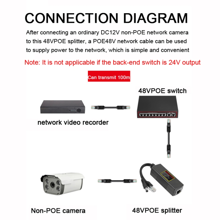 6. After connecting an ordinary DC12V non-POE network camera to this 48VPOE splitter, a single POE48V network cable can be used to supply power to the network, which is simple and convenient (note: the back-end switch is not applicable for 24V output)
