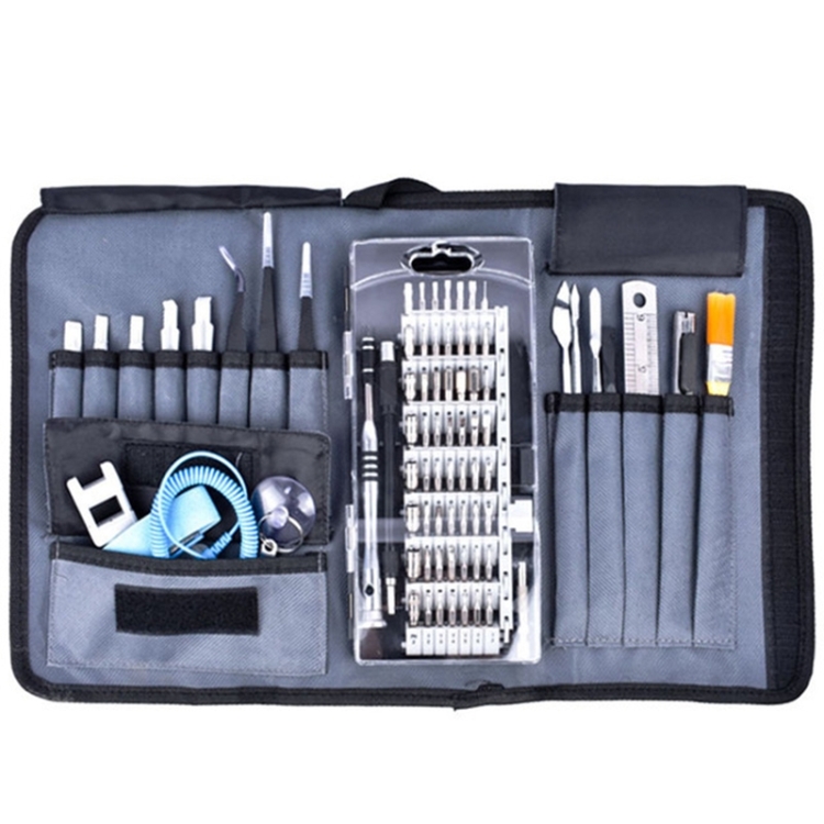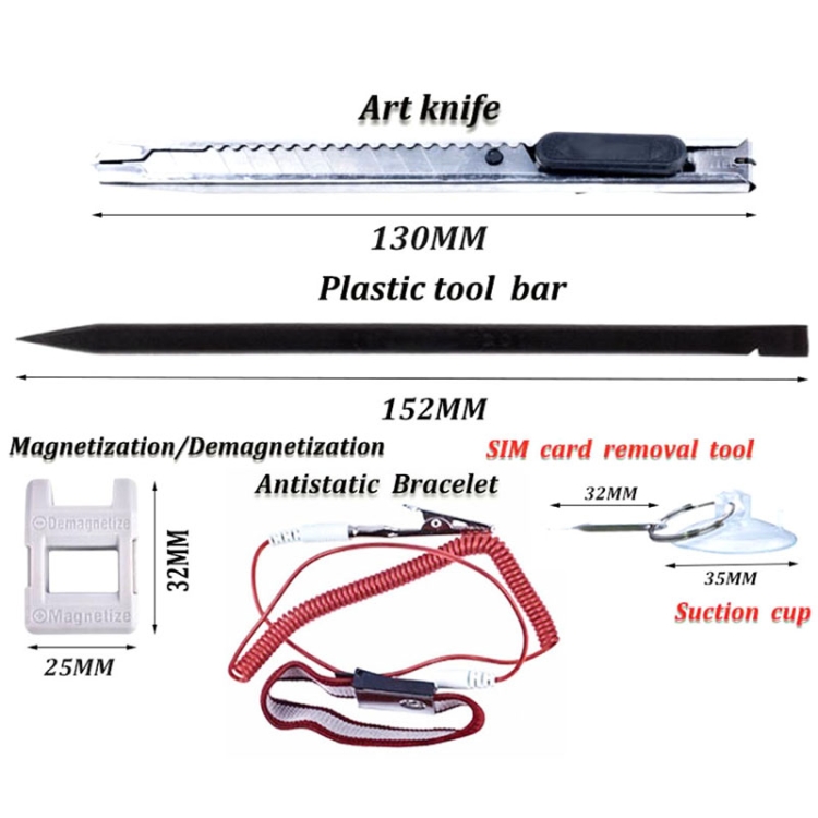 7. Combination details: 60-in-1 screwdriver set x 1, plastic pry bar x 5, triangular pry bar x 2, suction cup x 1, SIM card pin x 1, anti-static wrist strap x 1, magnetizer x 1, metal measuring rule x 1, metal crowbar x 3, plastic crowbar (T001) x 1, stainless steel utility knife x 1, stainless steel tweezers x 3, cleaning brush x 1