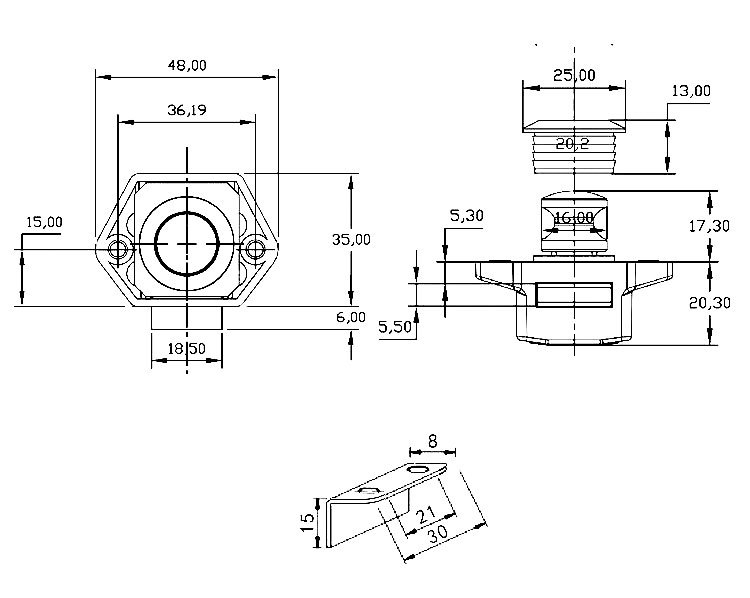 5. Size: 52.5 x 48 x 21mm; Hole diameter: 20mm; suitable thickness: 15-25mm