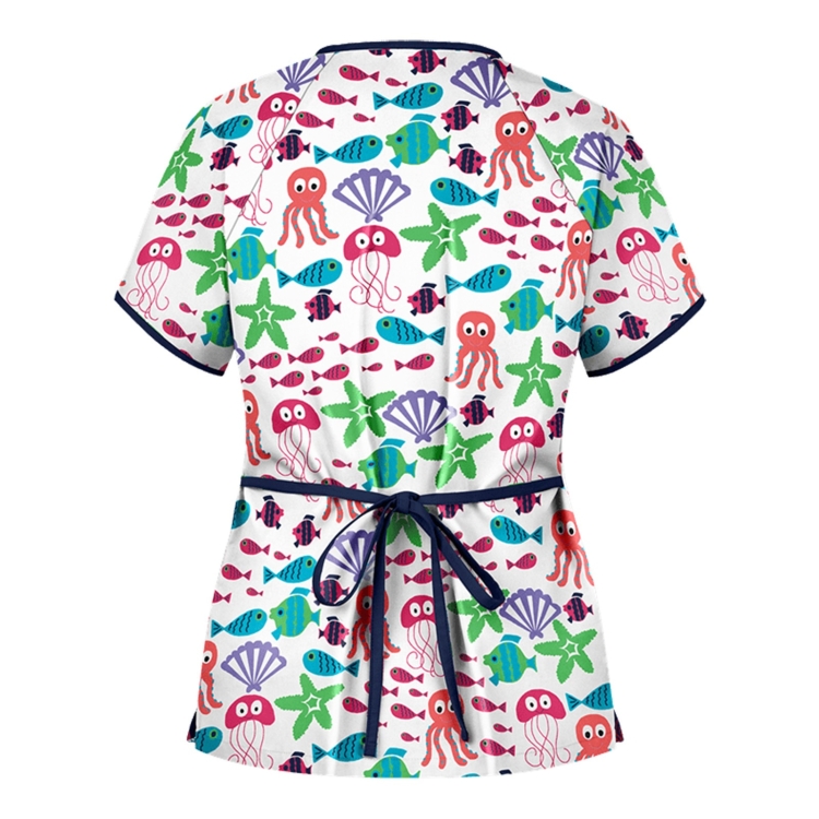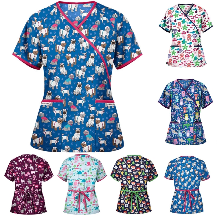 Printed V-neck Mid-length Nurse Uniform T-shirt (Color:Green Size:XXL)