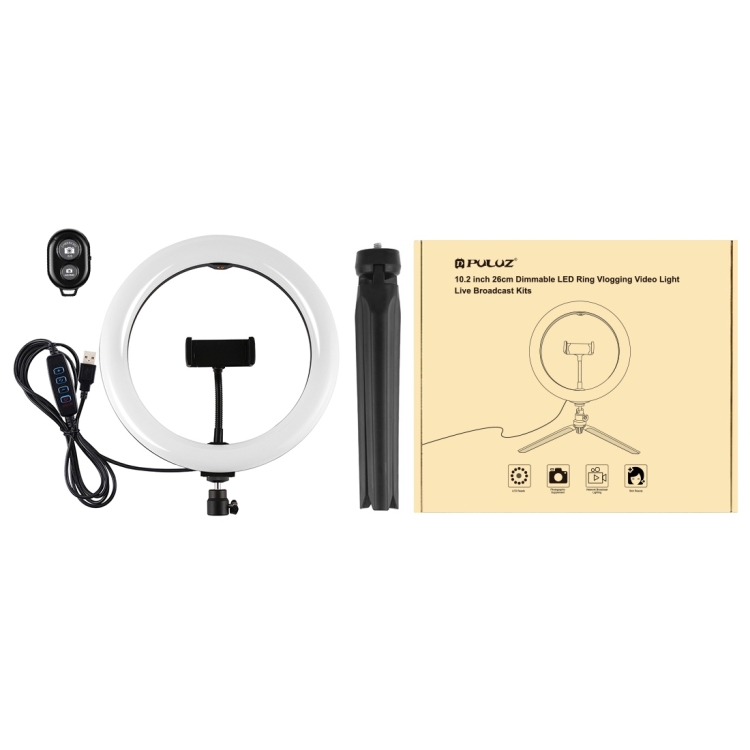 PULUZ 10.2 inch 26cm Light + Desktop Tripod Mount USB 3 Modes Dimmable Dual Color Temperature LED Curved Diffuse Light Ring Vlogging Selfie Photography Video Lights with Phone Clamp