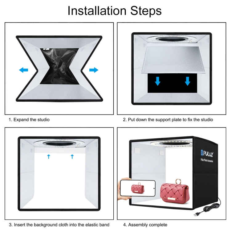 3. Easy to assemble (real three seconds to assemble and use), you can unfold this LED light box shed and place it on any surface to get a good background for commercial photography of small items and take pictures of the product.