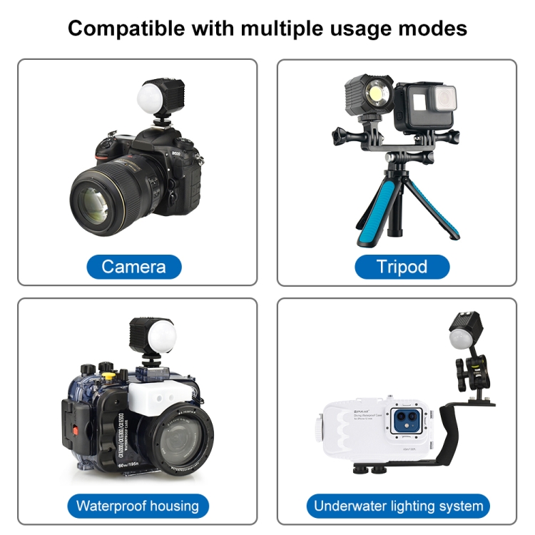 3. Waterproof and rechargeable: this photo light completely waterproof to 195ft (60m) out of the box, no housing needed! Built-in large capacity lithium battery, recharge your video light via the built-in Micro USB port on the back of the device.
