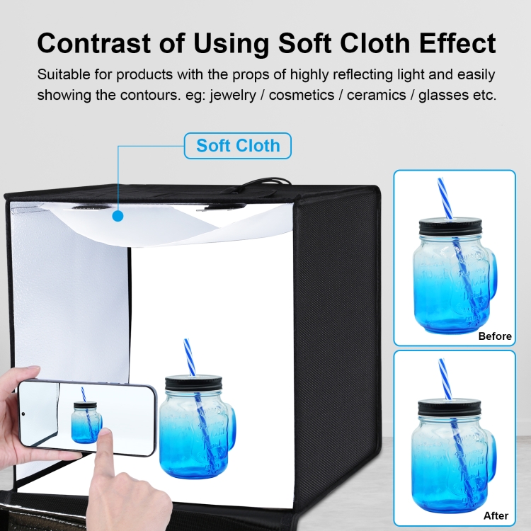 5. Practical and portable: Mini studio is portable because of the fold-storage design, the size is 60x60x60cm, great for taking picture for small objects such as toys, jewelry, watches, headphones, pens, dishes, cookies, etc, it is also an awesome gift for photographers, bloggers and artisans who want to present their works.