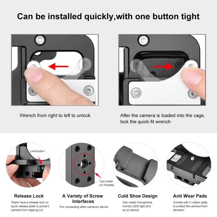 2. Stanble And Protection: The cage secures the camera via a 1/4 inch-20 screw on the bottom to further prevent twisting, rubber pads on the bottom protect your camera body from scratching.