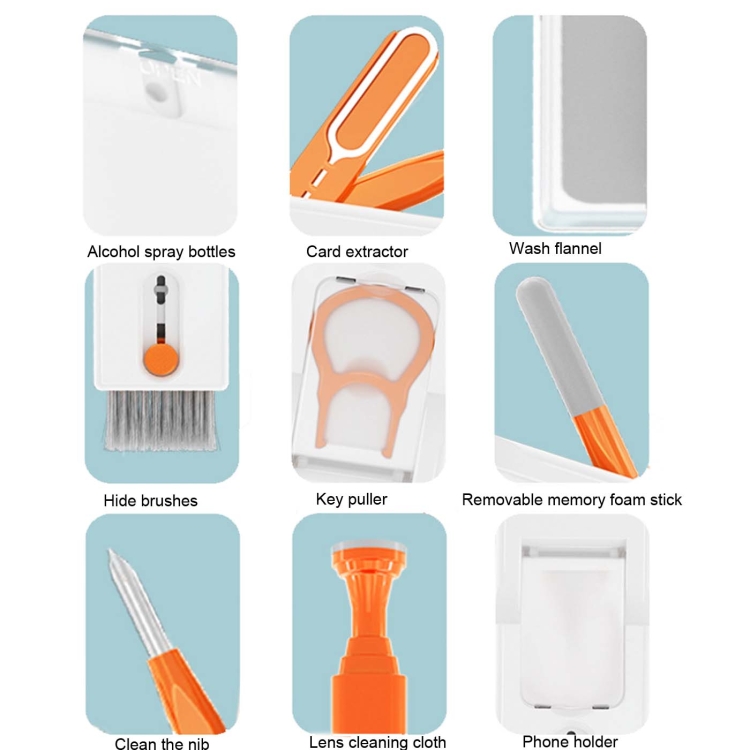 1. 11 major functions: alcohol spray bottle (alcohol-free) / card picker / washable lint / hidden brush / key puller / removable cotton swab / metal nib / lens cleaning cloth / phone holder / high-density brush / long bristles