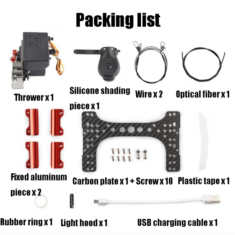 5. Packing list: Thrower x 1, silicone light shielding piece x 1, wire x 2, optical fiber x 1, fixed aluminum piece x 2, carbon plate x 1 + screw x 10, plastic tape x 1, rubber ring x 1, shading Cover x 1, USB charging cable x 1