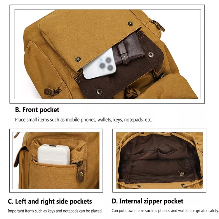 4. Structure: main bag drawstring opening and closing (built-in zipper pocket + inner pocket) + front pocket + side zipper pocket