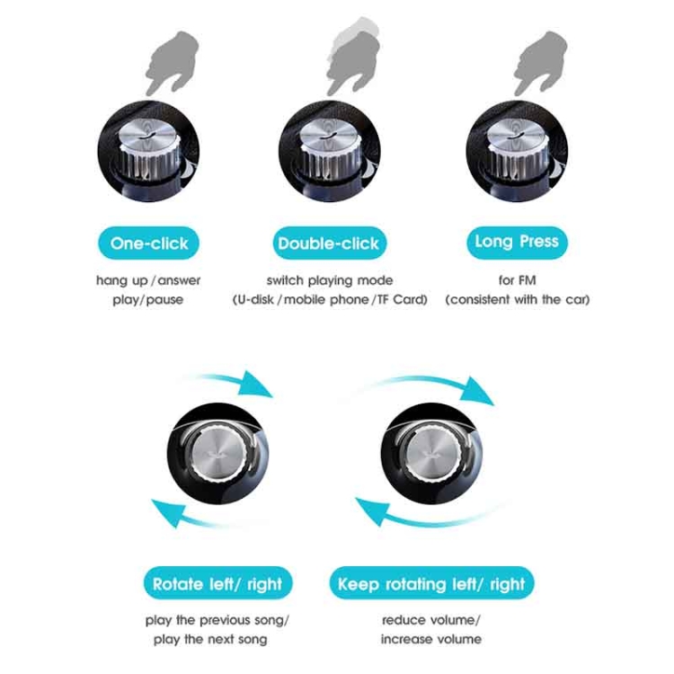 4. Simple operation, one key to hang up / answer the phone & switch the play mode & FM, rotate the button to adjust the volume size & previous/next song