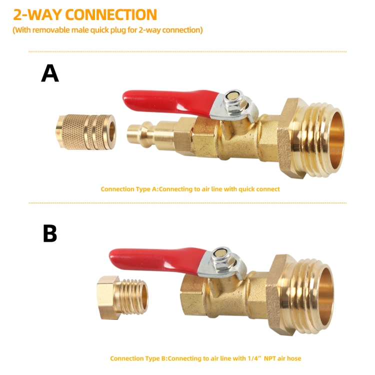 5. Easy to operate: screw the water pipe to the female thread side and connect the quick plug to the quick coupling onside the air compressor line, turn on the air compressor and rotate around the ball stem to open or close and adjust the air flow rate to blow dry water from the water pipe
