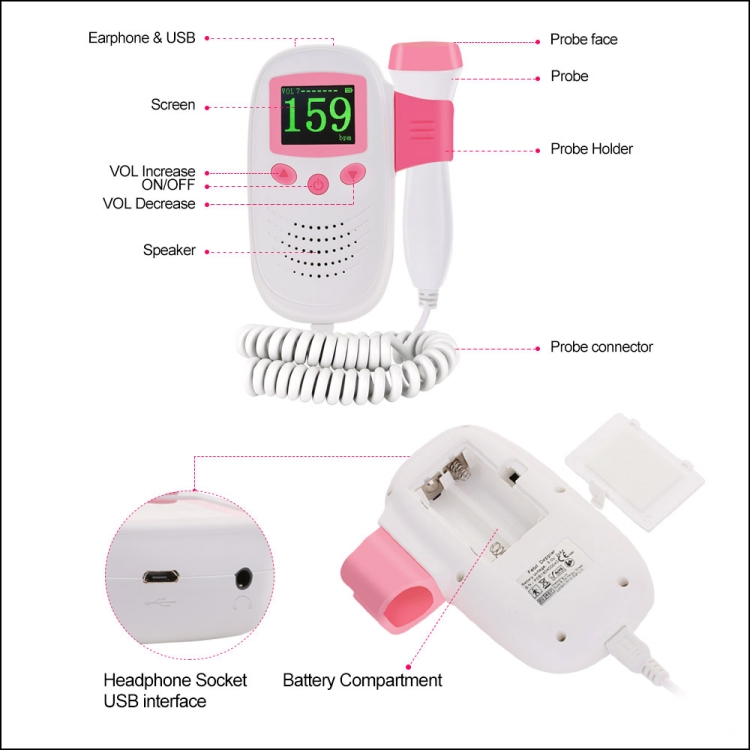 RZ-100S9 LED Fetal Doppler Ultrasound Sound Baby Heartbeat Detector Monitor Digital Prenatal Pocket Fetal Doppler Stethoscope