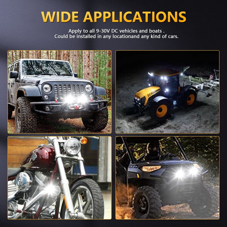 6. Widely used: Compatible with most motorcycles, jeeps, 4X4s, trucks, tractors, trailers, golf carts, pickup trucks, cars, motorcycles, SUVs, ATVs and boats. It can also be used as indoor and outdoor lighting, such as garden lighting, backyard lighting, off-road lighting, reversing lights, architectural lighting, etc.