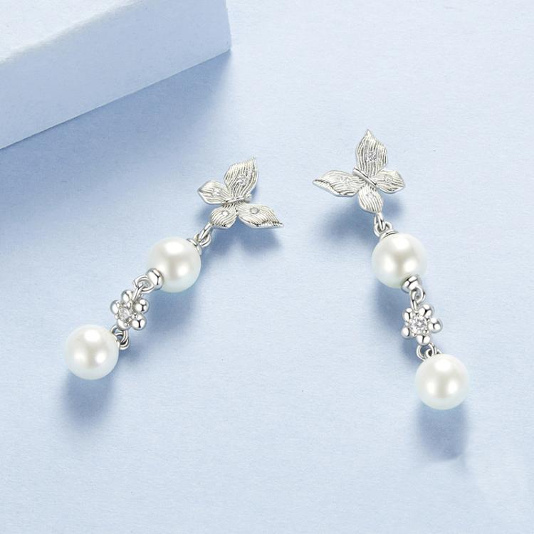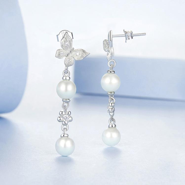 S925 Sterling Silver Elegant Butterfly Shell Bead Long Earrings