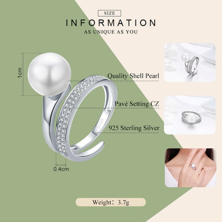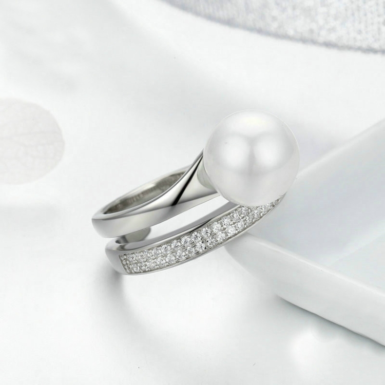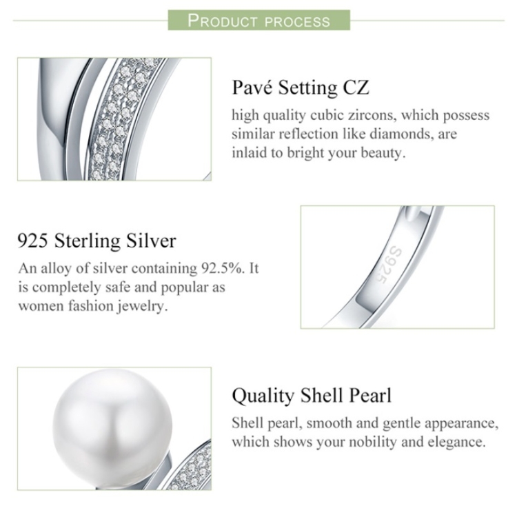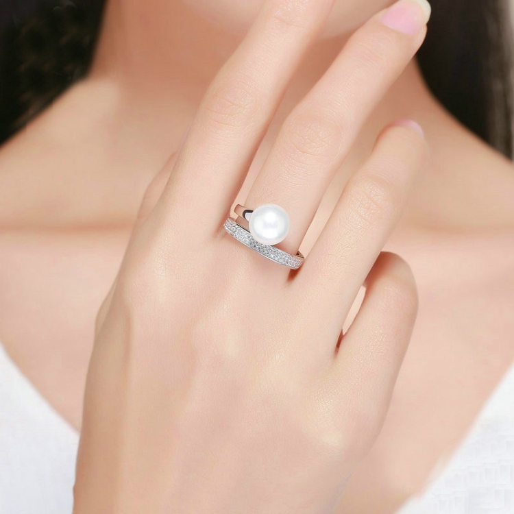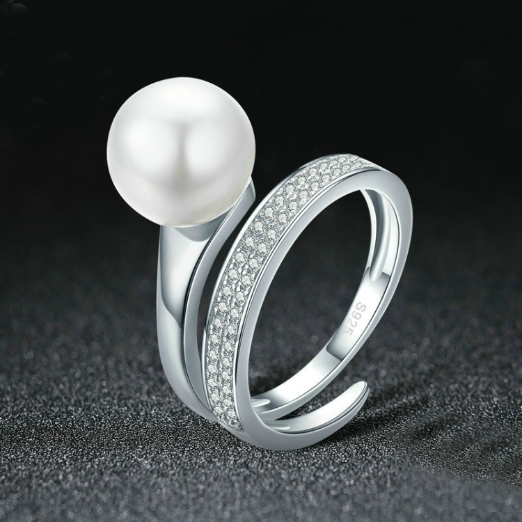 S925 Sterling Silver Elegant Ladies Ring Platinum Plated Diamond Pearl Ring