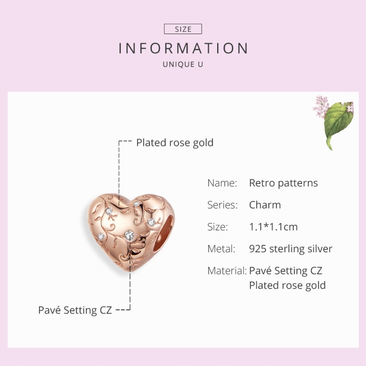 S925 Sterling Silver Heart-shaped Retro Pattern Rose Gold Plated Beads DIY Bracelet Accessory