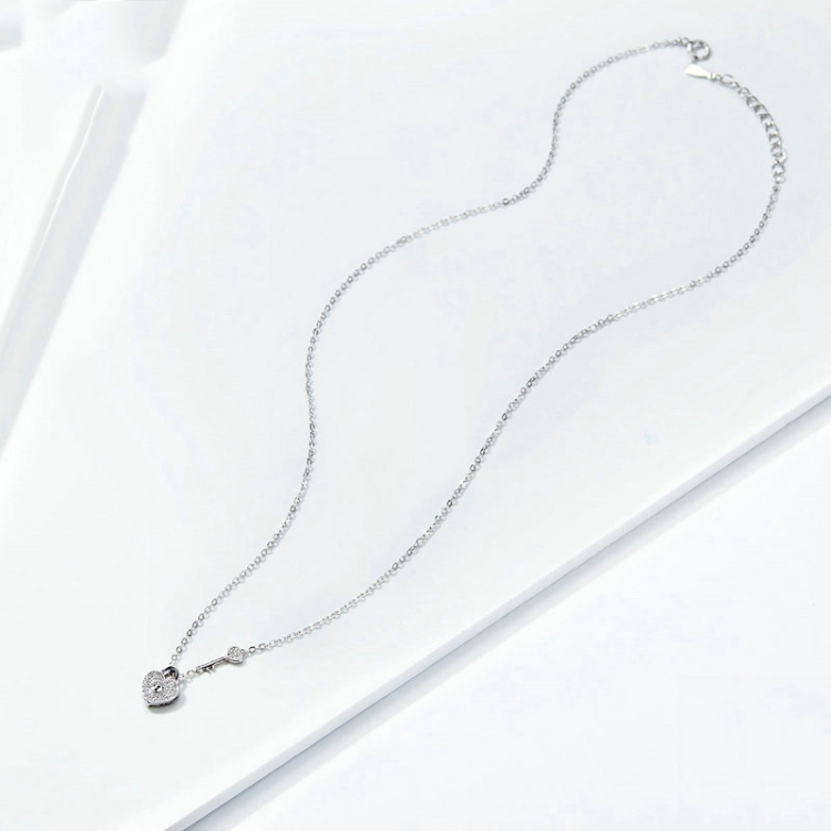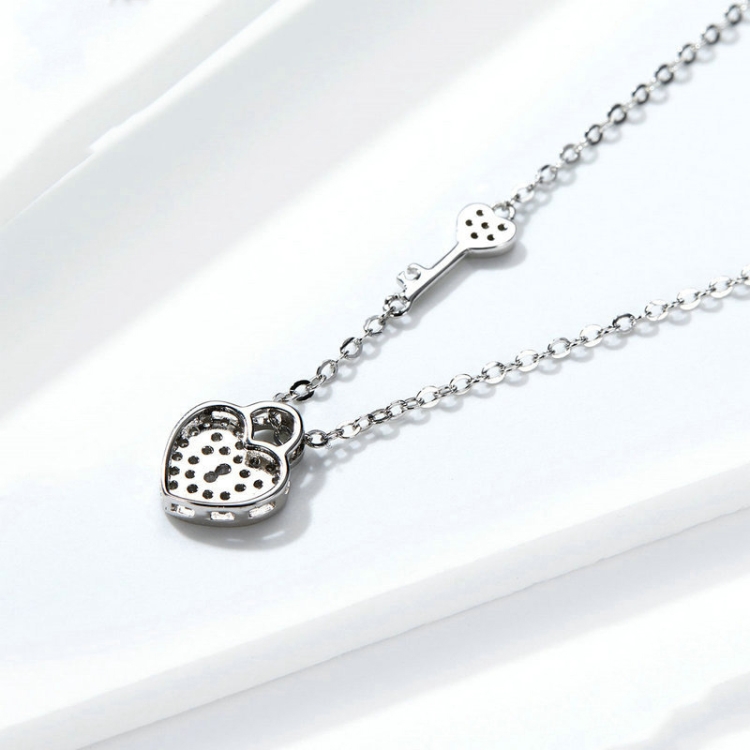 S925 Sterling Silver Platinum Plated Heart Lock Necklace Girls White Inlaid Zircon Key Jewelry