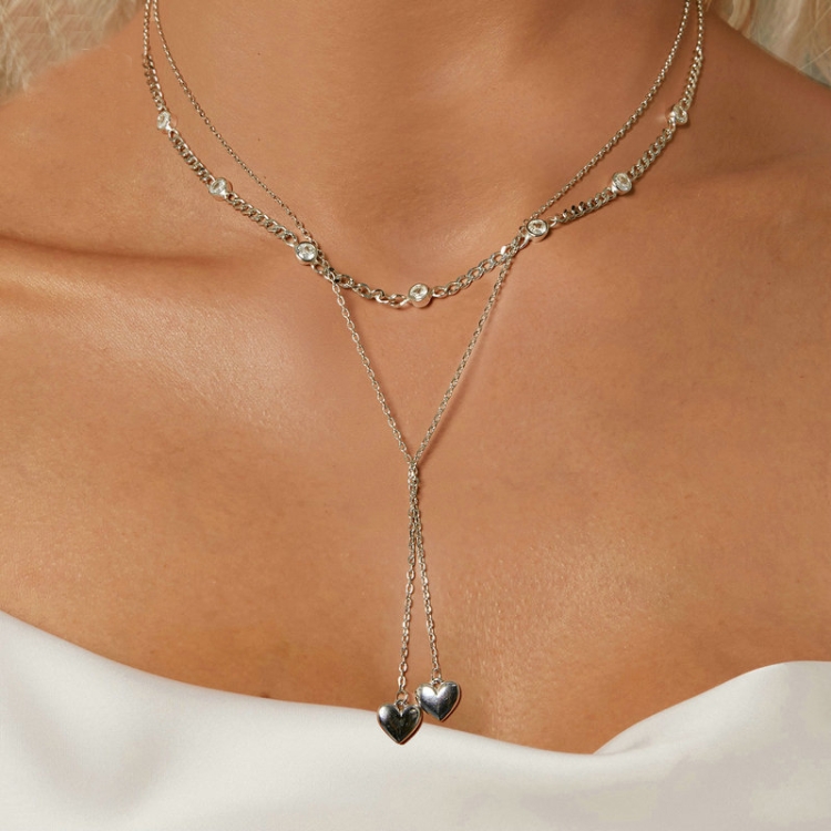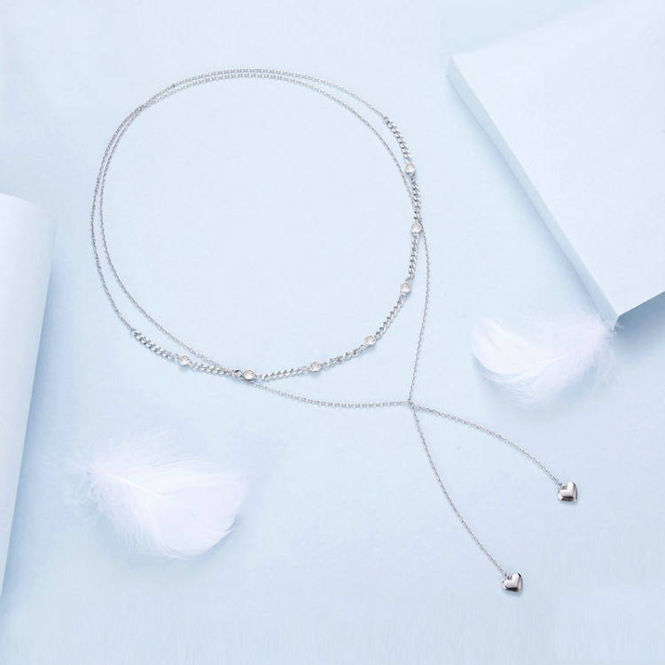 S925 Sterling Silver Platinum Plated Heart Shaped Double Sweater Necklace