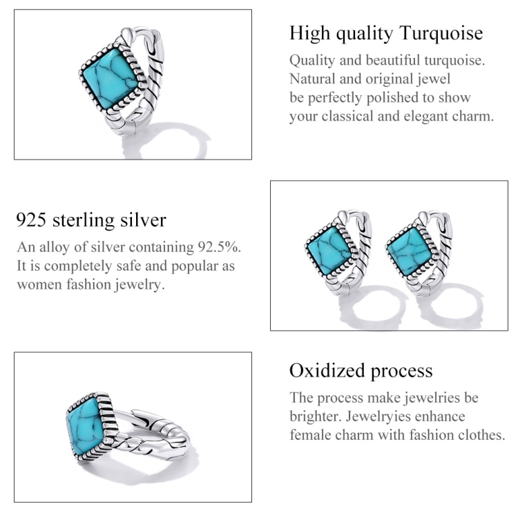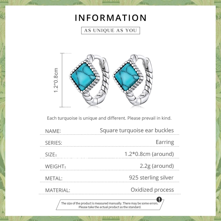 S925 Sterling Silver Square Turquoise Ear Buckle Women Earrings