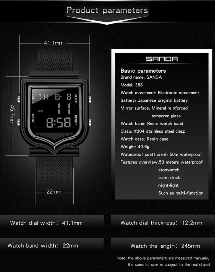SANDA 388 Fashionable Square Outdoor Sports Leisure Watch Men’s And Women’s Multi-Functional Waterproof Luminous Electronic Watch
