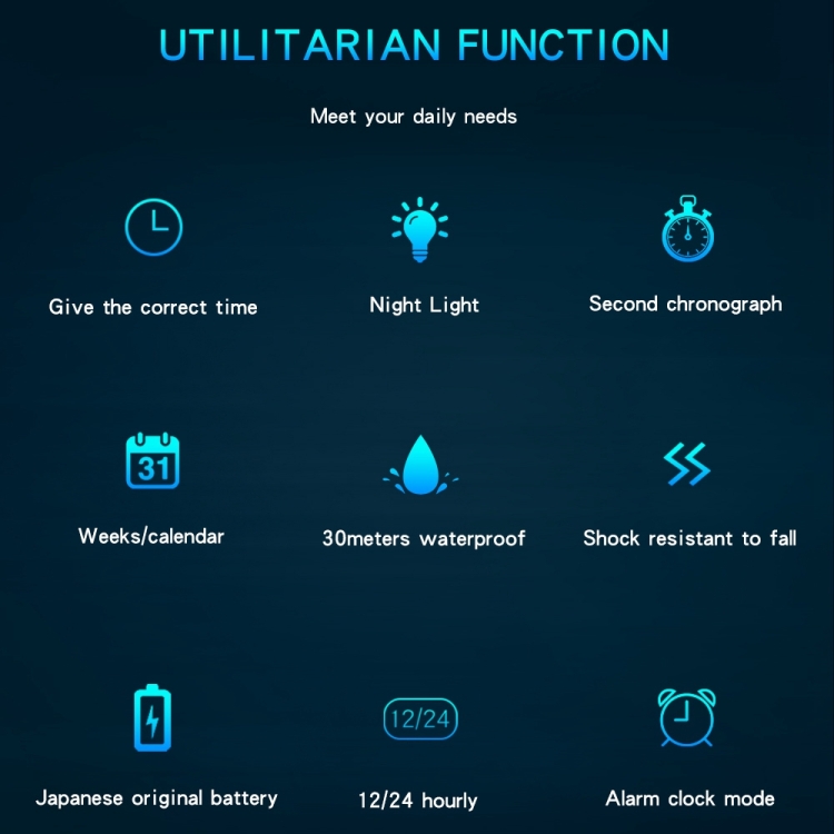 3. Special features: Luminous, GMT, week display, alarm, chronograph, month display, calendar, 24-hour indication