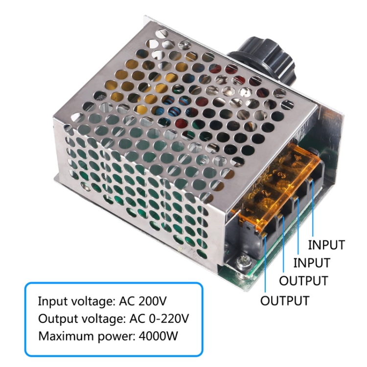 5. 4000W voltage regulator, technology upgrades, voltage range from 10V-220V smoothly adjustable, more suitable for industrial enterprises that need low voltage to drive the heating wire, such as cutting styrofoam, pearl cotton, raincoat production and so on