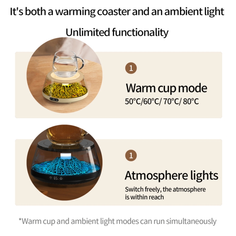 2. It is both a warming cup mat and an atmosphere lamp, and the two modes can run at the same time