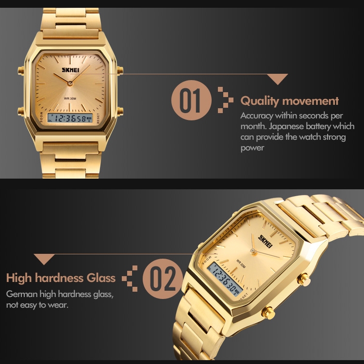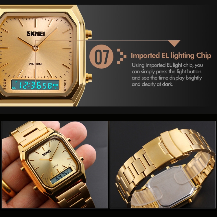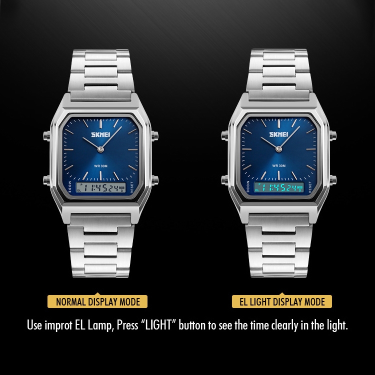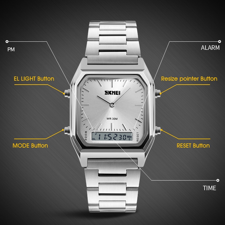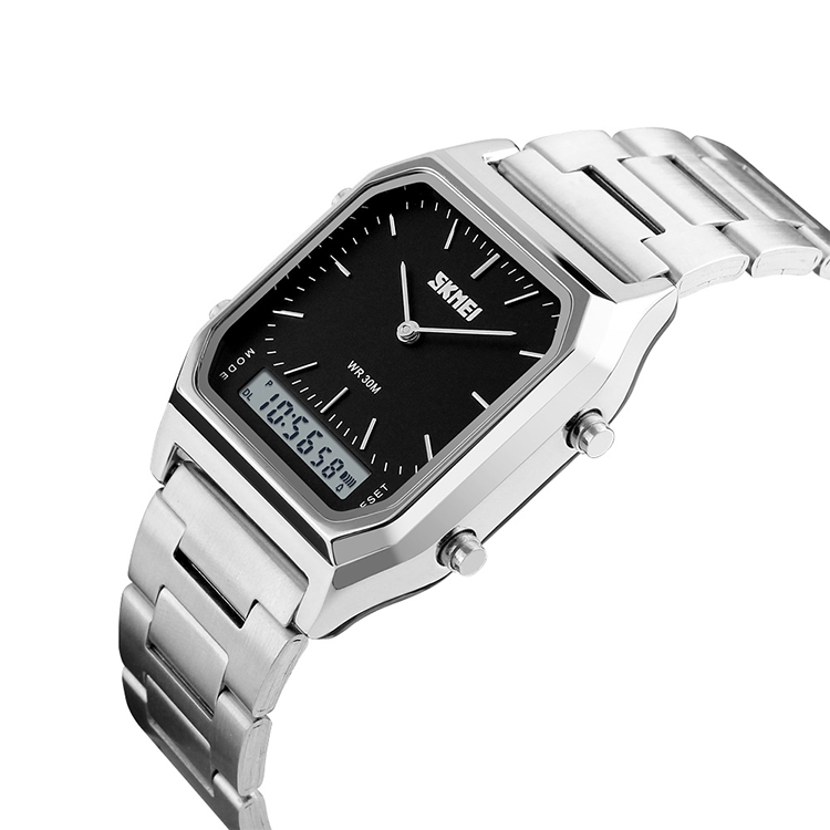 SKMEI 1220 Multifunctional Men Outdoor Business Noctilucent Waterproof Double Display Steel Watchband Wrist Watch