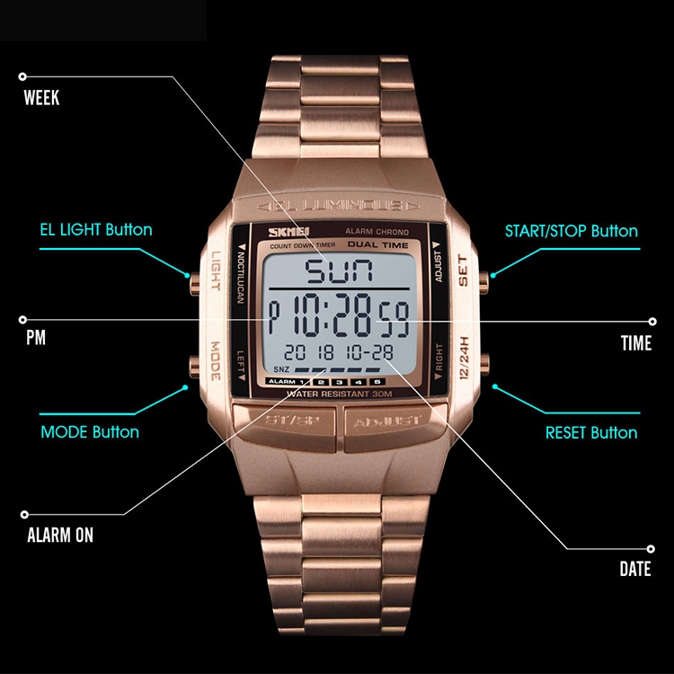 5. Function: dual time display, stopwatch timing, display date, timed alarm, display day, night light, 12/24 hour system, countdown, hourly hour