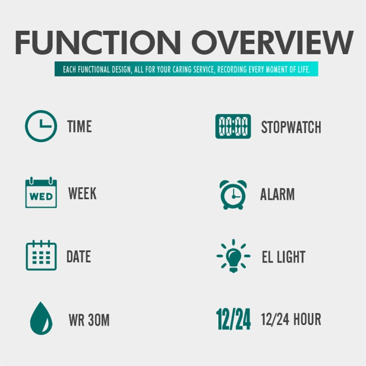 5. Functions: time, stopwatch, date, timer alarm, night light