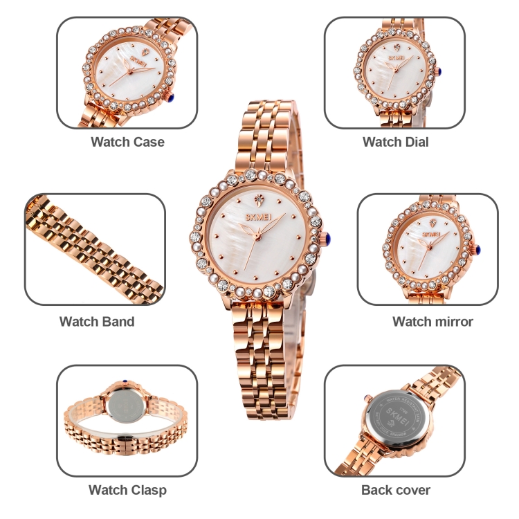 SKMEI 1799 Pearl Diamond Round Dial Stainless Steel Strap Quartz Watch for Ladies