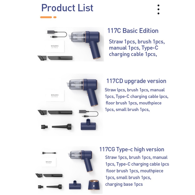 -117CD: Vacuum cleaner x 1, straw x 1, brush x 1, manual x 1, Type-C/USB-C charging cable x 1, floor brush x 1, mouthpiece x 1, small brush x 1